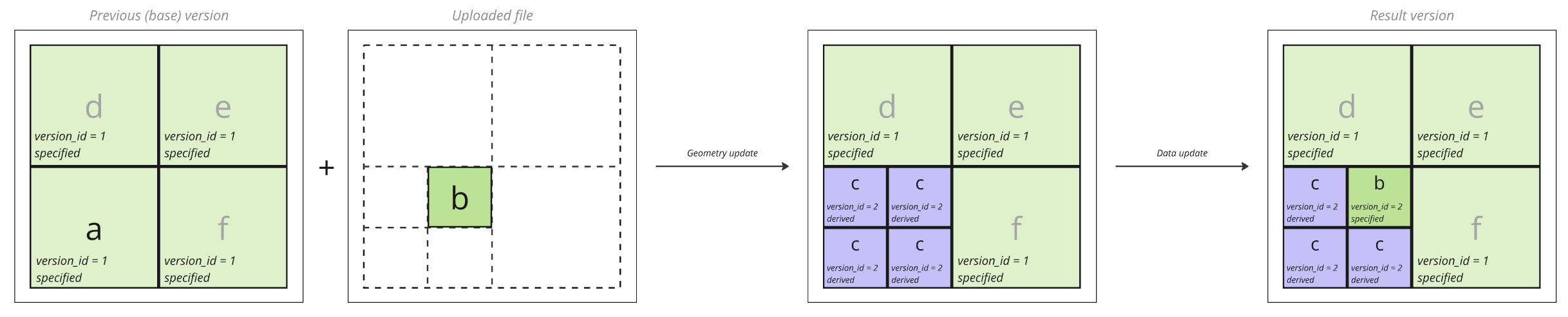 Here, refers to the parent block's value in the previous version; refers to the value in the uploaded sub-block; and refers to the value derived (which could either equal or , depending on its column unit type). Values , , and refer to blocks not referred to by the uploaded file, and these blocks are identical after the update.